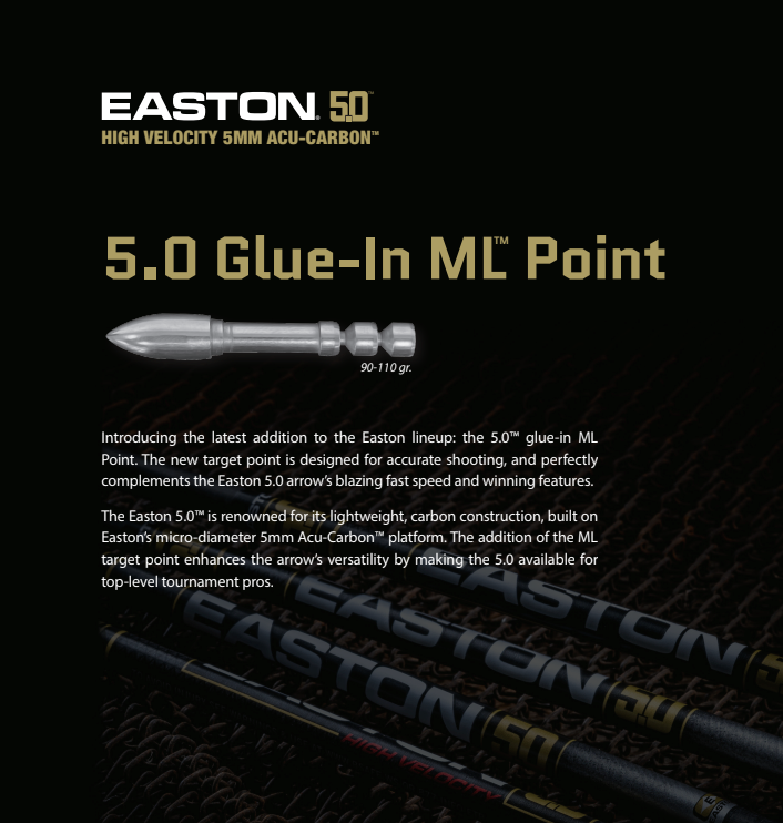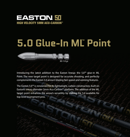 The Easton 5.0™ is renowned for its lightweight, carbon construction, built on Easton’s micro-diameter 5mm Acu-Carbon™ platform. The addition of the ML target point enhances the arrow’s versatility by making the 5.0 available for top-level tournament pros.