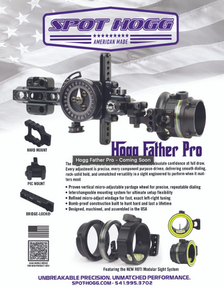 The Hogg Father Pro™ features a vertical micro-adjustable yardage wheel, refined micro-adjust windage, and a precision dovetail mounting system for fast setup and exact repeatability. Designed for serious archers who demand stability, adjustability, and long-term durability in a single movable sight.
