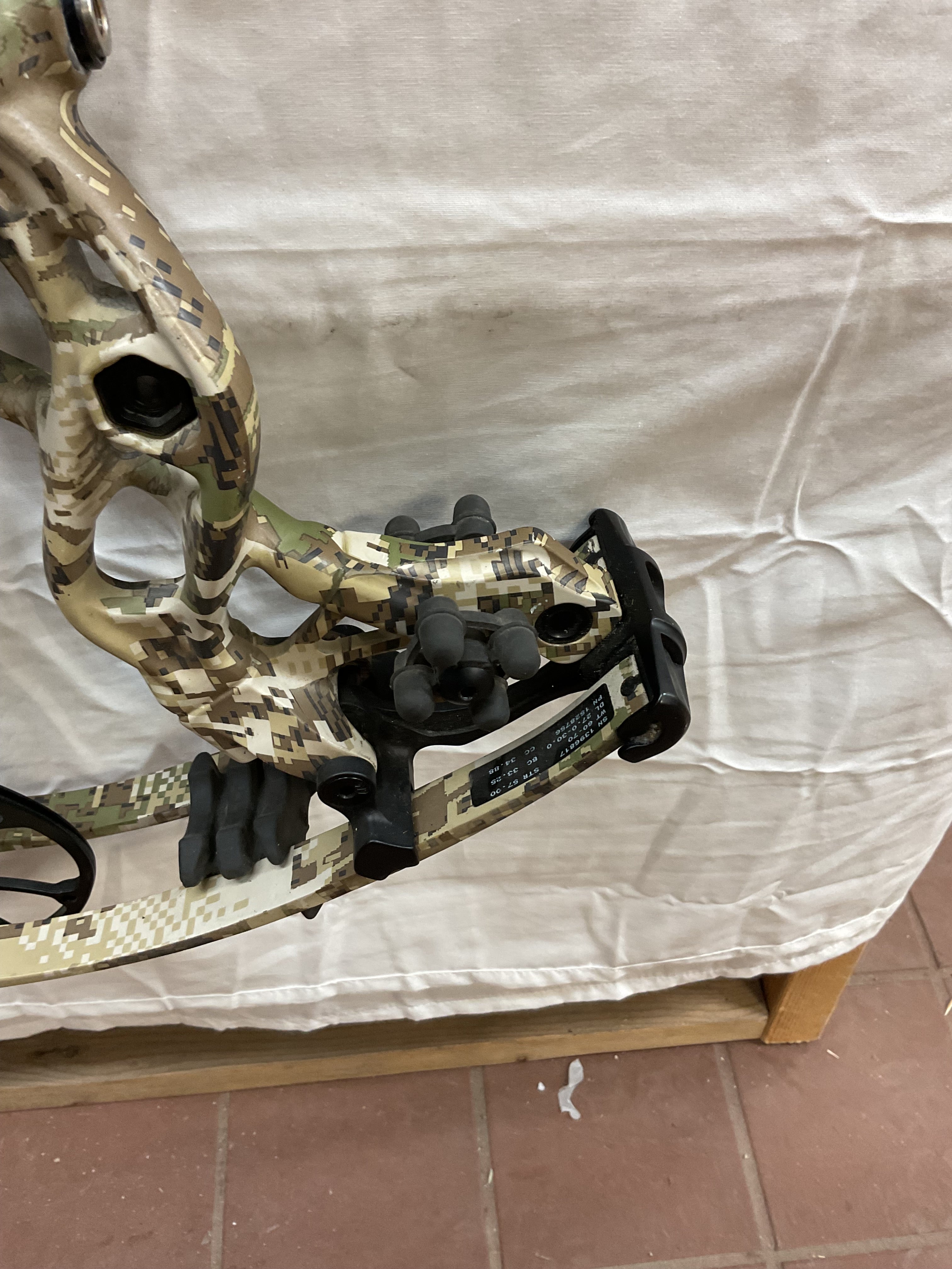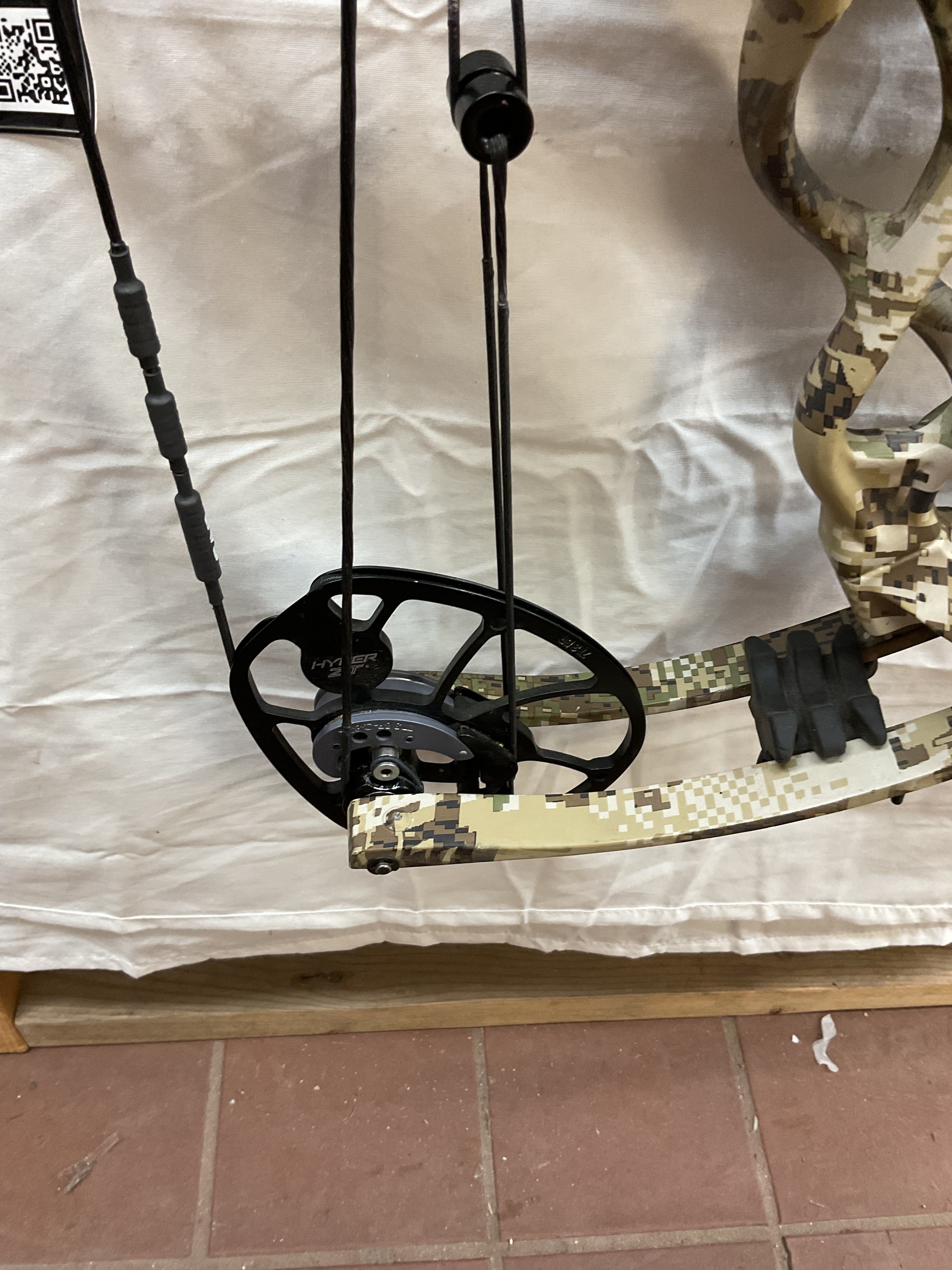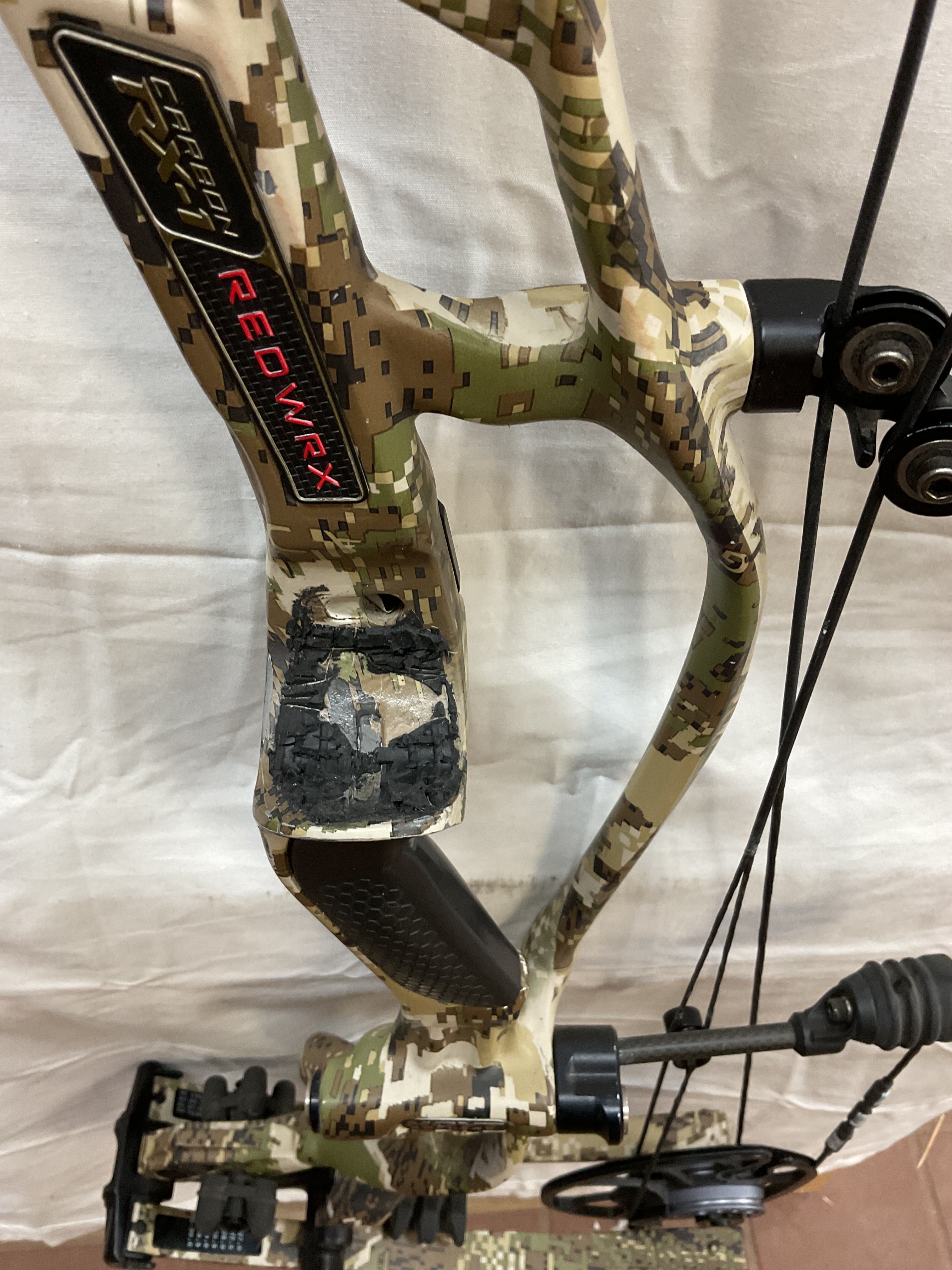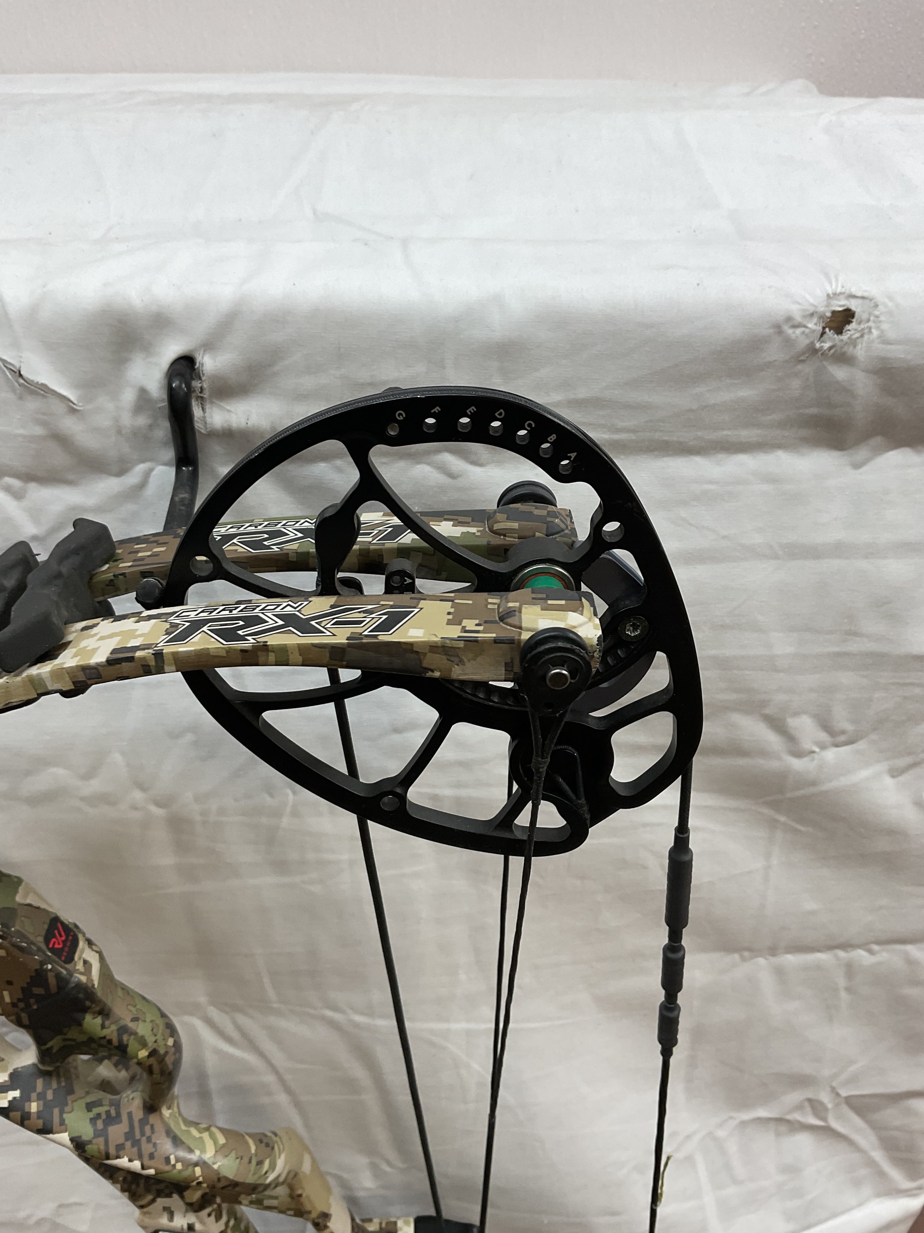 This bow has brand new Gas strings installed and timed by our techs. The bow is in Fair condition. Has paint chips on riser, rubber on arrow shelve is all tore up, paint chips on limbs and cams.