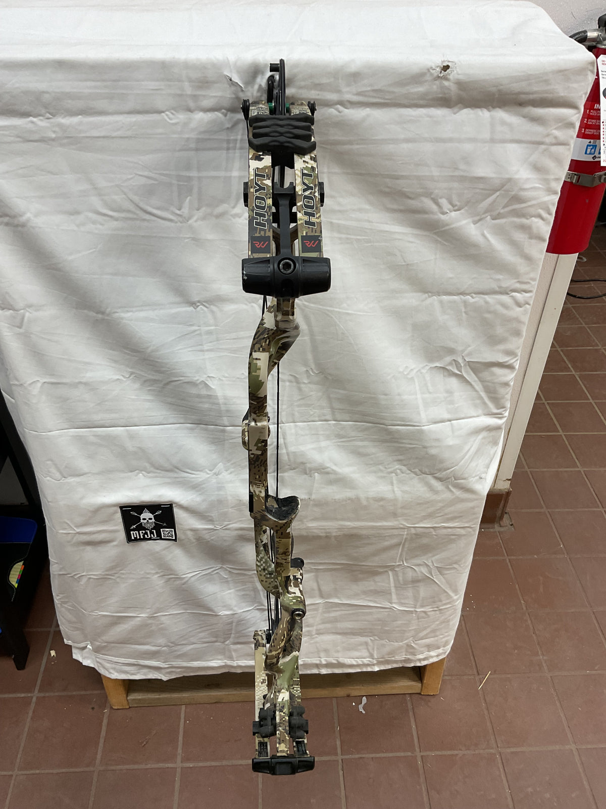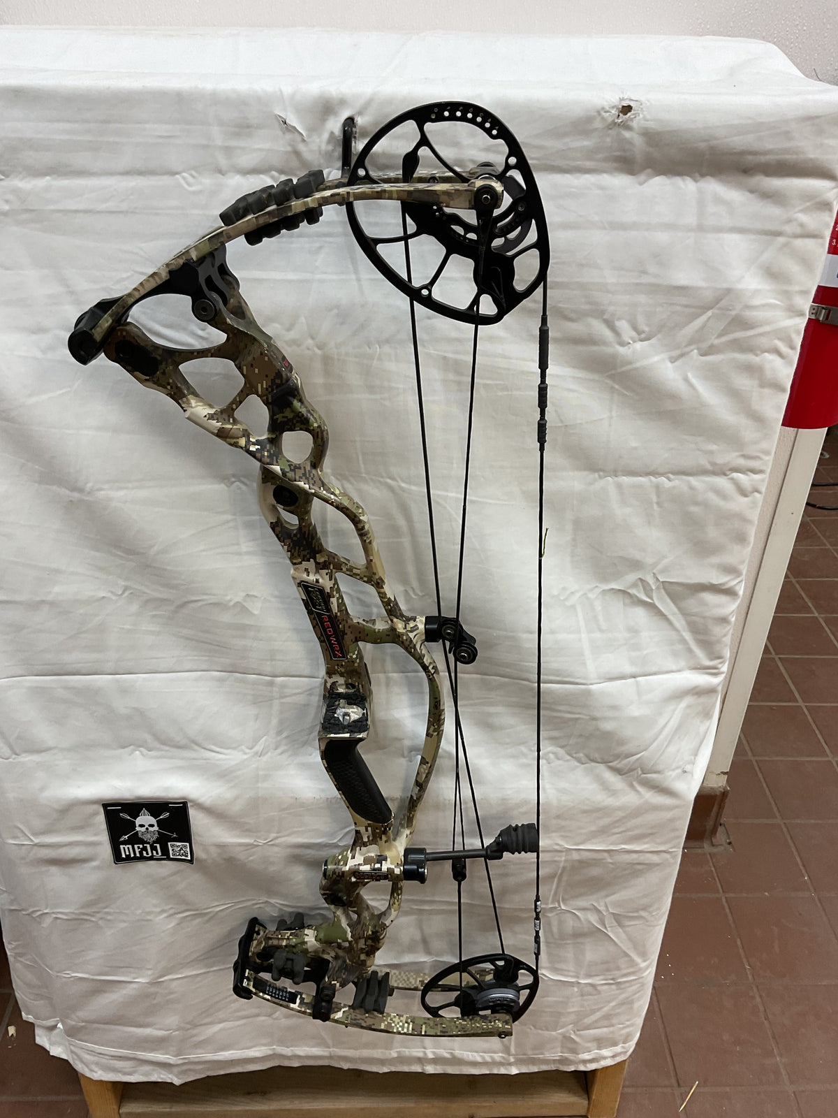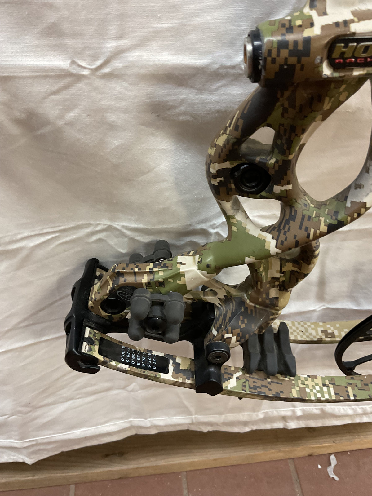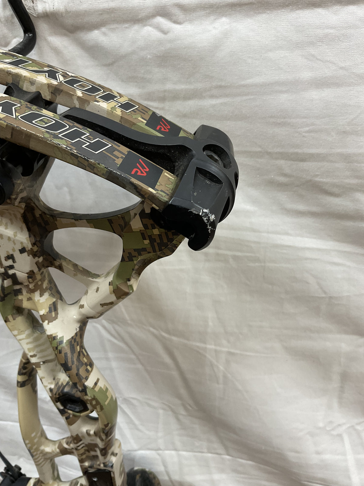 This bow has brand new Gas strings installed and timed by our techs. The bow is in Fair condition. Has paint chips on riser, rubber on arrow shelve is all tore up, paint chips on limbs and cams.